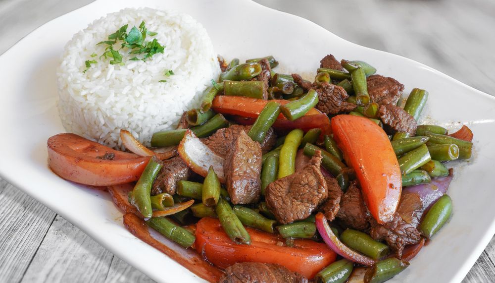 Tender angus beef, green beans sautéed with onions and tomatoes, served with white rice