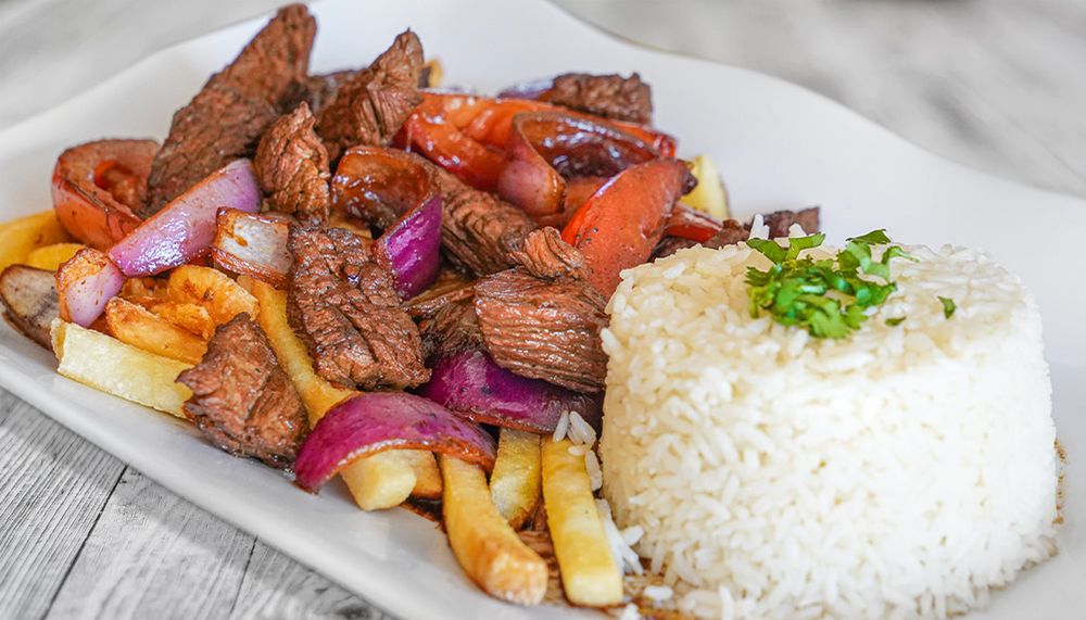 Tender angus beef sautéed with onions and tomatoes over a bed of french fries served with white rice