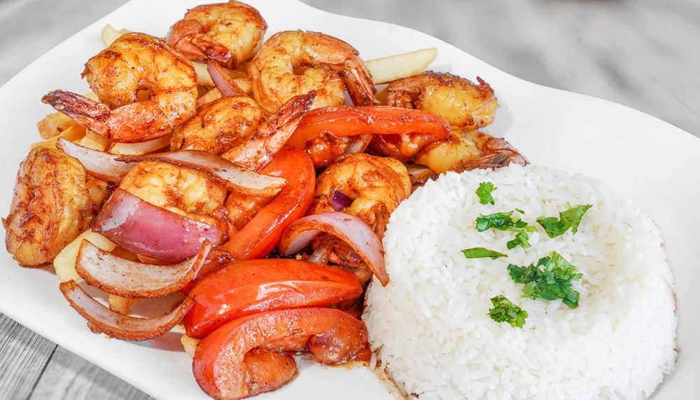 A generous 32 oz serving of peruvian style fried rice mixed with jumbo shrimp, eggs & green onions