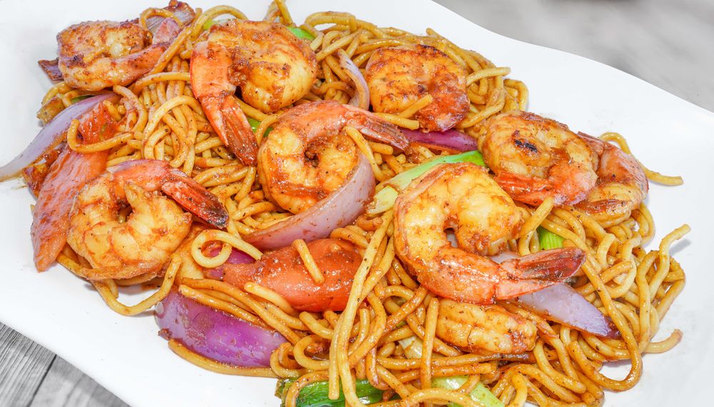 Jumbo shrimp sautéed with onions and tomatoes over a bed of french fries, served with rice and 1 yellow sauce